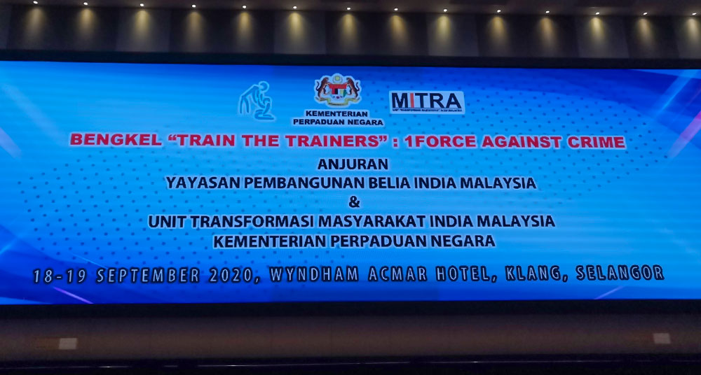 Bengkel Train The Trainers: 1Force Against Crime organized by Malaysian Indian Youth Development Foundation (MIYDF) in collaboration with Unit Transformasi Masyarakat India Malaysia (MITRA), Kementerian Perpaduan Negara at Hotel Wyndham Acmar, Klang. This training was held to enable the participants to understand the fundamentals of 1Force Against Crime trainings and what is required of them when they are to facilitate and conduct the training sessions.